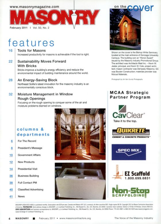 MASONRY (ISSN 0025-4681) is published monthly Subscription rate $29 per year; Canada and Maico $47 (US. cumency all other countries 565. Single copies $8.50. Copyright 2011 by Mason Contractors Association of America POSTMASTER: Send address changes to MASONRY, Lionheart Publishing, Inc., 506 Rowel St, Ste. 220, Marieta, GA 30000. Canadian return address: Station A, PO Box 54 Windset A65