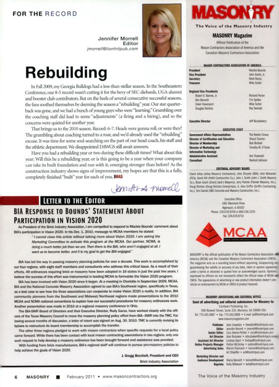 As President of the Brick Industry Association, I am compelled to respond to Mackie Bounds' comment about BIA's participation in Vision 2020. In his Dec. 1, 2010, message to MCAA members he stated:
