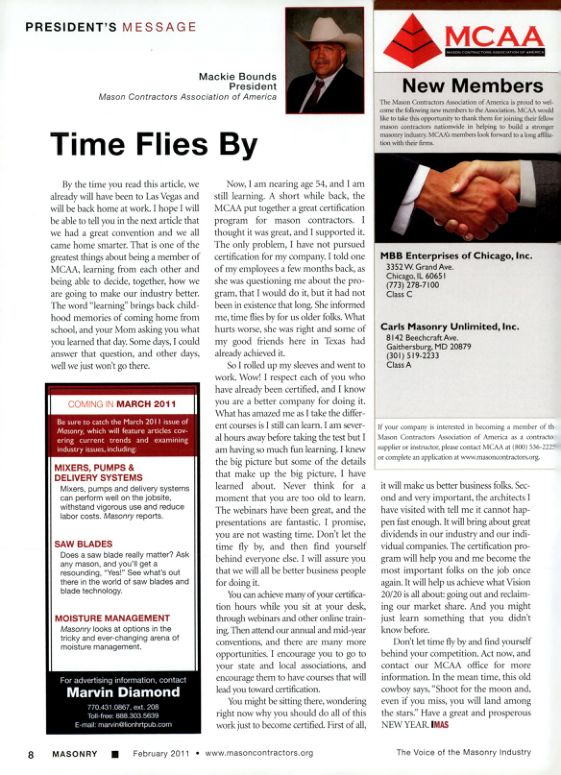 Now, I am nearing age 54, and I am still learning. A short while back, the MCAA put together a great certification program for mason contractors. I thought it was great, and I supported it. The only problem, I have not pursued certification for my company. I told one of my employees a few months back, as she was questioning me about the program, that I would do it, but it had not been in existence that long. She informed me, time flies by for us older folks. What hurts worse, she was right and some of my good friends here in Texas had already achieved it.