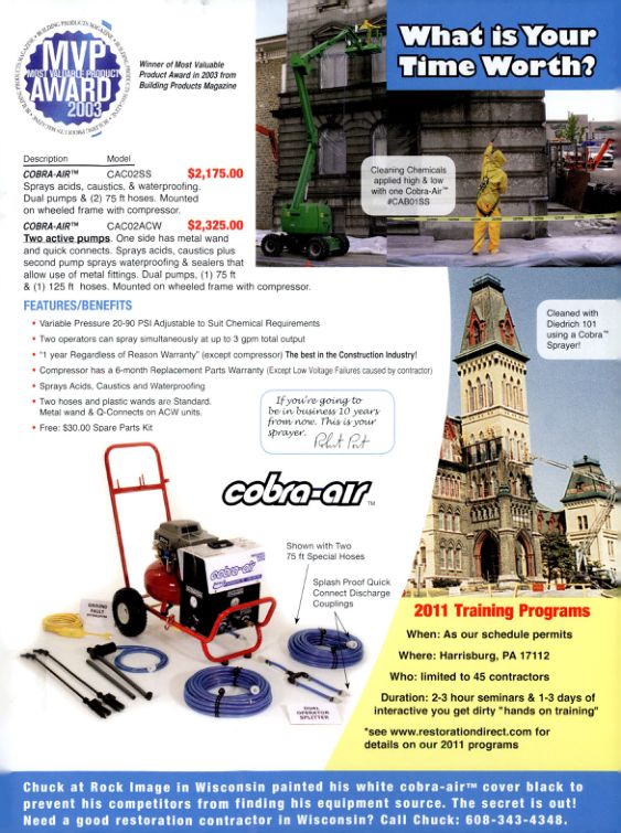 Chuck at Rock Image in Wisconsin painted his white cobra-air™ cover black to prevent his competitors from finding his equipment source. The secret is out! Need a good restoration contractor in Wisconsin? Call Chuck: 608-343-4348.