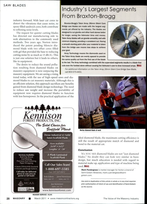 The request for quieter cutting blades has directed our manufacturing side to seek alternatives to the commonly used methods. Two years ago, Norton introduced the patent pending Silencio diamond blade with two offset cores filled with gel that provided the base to reducing cutting noise by as much as 15 db(A). This is just one solution but it leads to others, like in equipment.