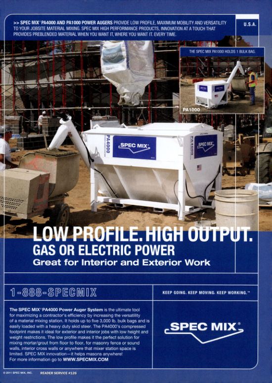 The SPEC MIX™ PA4000 Power Auger System is the ultimate tool for maximizing a contractor's efficiency by increasing the versatility of a material mixing station. It holds up to five 3,000 lb. bulk bags and is easily loaded with a heavy duty skid steer. The PA4000's compressed footprint makes it ideal for exterior and interior jobs with low height and weight restrictions. The low profile makes it the perfect solution for mixing mortar/grout from floor to floor, for masonry fence or sound walls, interior cross walls or anywhere that mixer station space is limited. SPEC MIX innovation-it helps masons anywhere! For more information go to WWW.SPECMIX.COM
