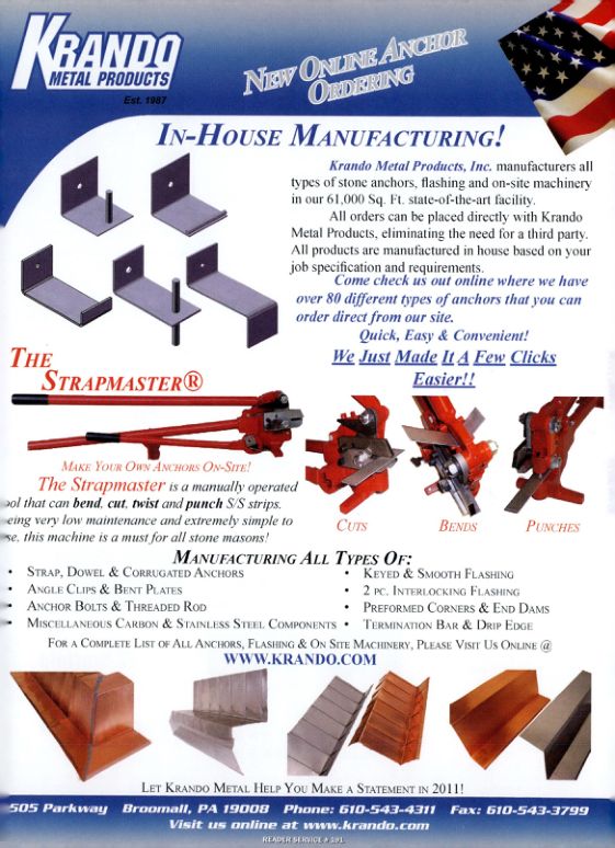 Krando Metal Products, Inc. manufacturers all types of stone anchors, flashing and on-site machinery in our 61,000 Sq. Ft. state-of-the-art facility.