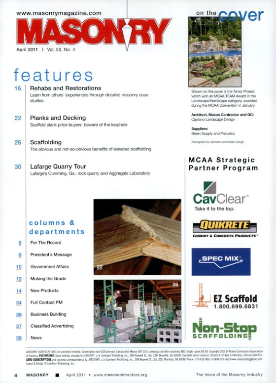 MASONRY (153N 0025-4681) is published monthly. Sabscription rate $29 per year, Canada and Mexico 547 (US. curency); all other countries $65 Single copies $8.50. Copyright 2011 by Masan Contractors Association of America. POSTMASTER: Send address changes to MASONRY, c/o Lionheart Publishing, Inc, 506 Roswell St., Ste 220, Marietta, GA 30060. Canadian retum address: Station A, PO Box 54 Windsor, Ontario NBA-605.