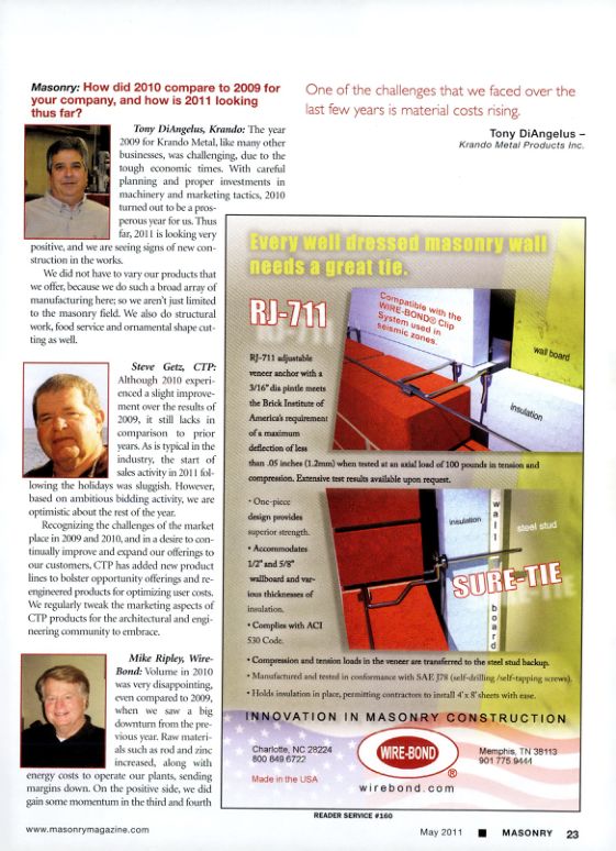 Tony DiAngelus, Krando: The year 2009 for Krando Metal, like many other businesses, was challenging, due to the tough economic times. With careful planning and proper investments in machinery and marketing tactics, 2010 turned out to be a prosperous year for us. Thus far, 2011 is looking very positive, and we are seeing signs of new construction in the works.