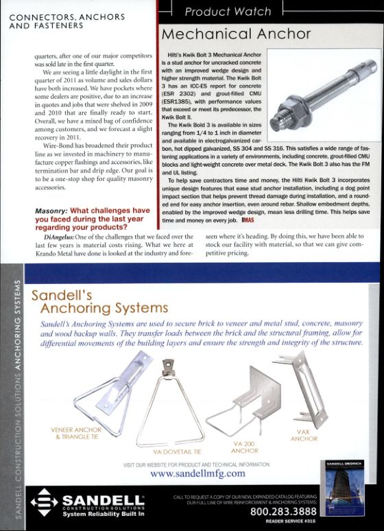 Sandell's Anchoring Systems are used to secure brick to veneer and metal stud, concrete, masonry and wood backup walls. They transfer loads between the brick and the structural framing, allow for differential movements of the building layers and ensure the strength and integrity of the structure.