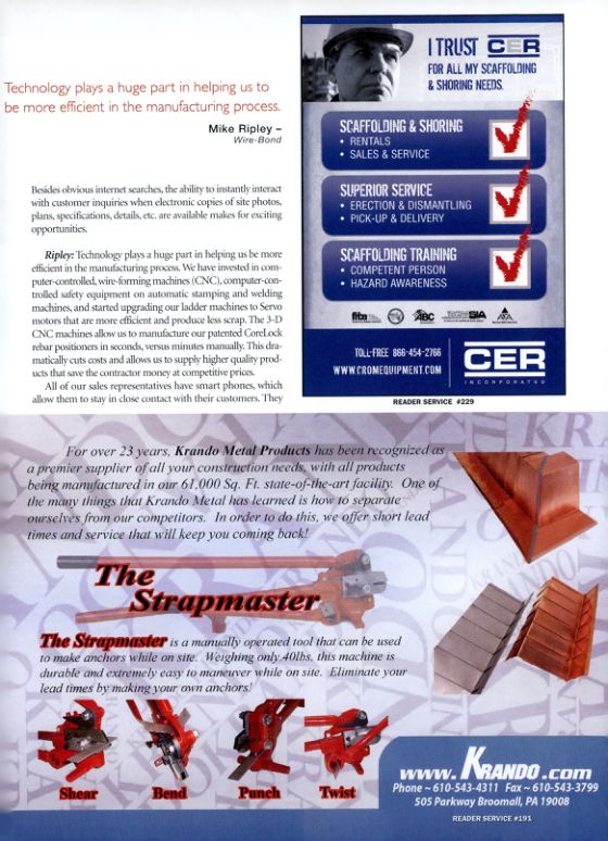 Ripley: Technology plays a huge part in helping us be more efficient in the manufacturing process. We have invested in computer-controlled, wire-forming machines (CNC), computer-controlled safety equipment on automatic stamping and welding machines, and started upgrading our ladder machines to Servo motors that are more efficient and produce less scrap. The 3-D CNC machines allow us to manufacture our patented CoreLock rebar positioners in seconds, versus minutes manually. This dramatically cuts costs and allows us to supply higher quality products that save the contractor money at competitive prices.