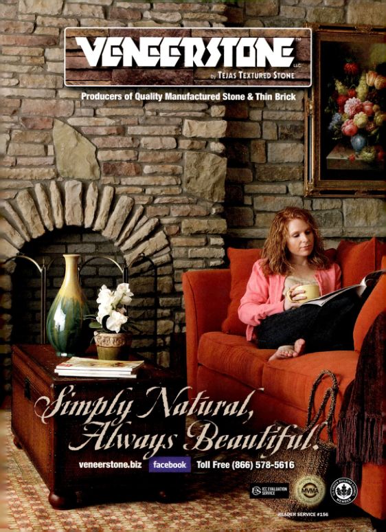 Masonry Magazine June 2011 Page. 7 Masonry Magazine June 2011 Page. 7 VENEERSTONEby TEJAS TEXTURED STONEProducers of Quality Manufactured Stone & Thin BrickSimply Natural, Always Beautiful.veneerstone.biz facebook Toll Free (866) 578-5616ICC EVALUATION MVMAREADER SERVICE #156