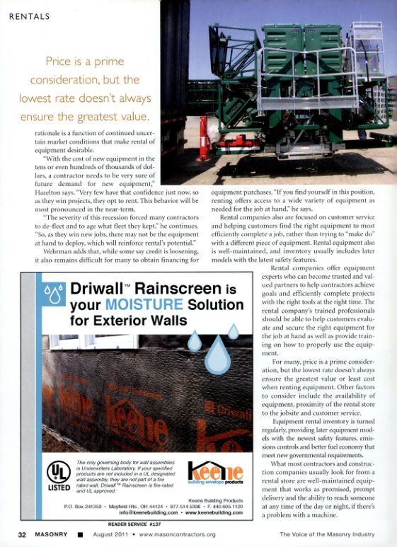Wehrman adds that, while some say credit is loosening, it also remains difficult for many to obtain financing for equipment purchases. "If you find yourself in this position, renting offers access to a wide variety of equipment as needed for the job at hand," he says.