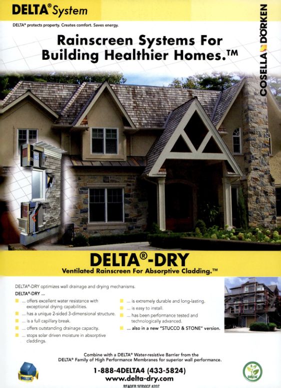 DELTA®-DRY offers excellent water resistance with exceptional drying capabilities. It has a unique 2-sided 3-dimensional structure. It is a full capillary break. It offers outstanding drainage capacity. It stops solar driven moisture in absorptive claddings. It is extremely durable and long-lasting. It is easy to install. It has been performance tested and technologically advanced. It is also in a new "STUCCO & STONE" version.