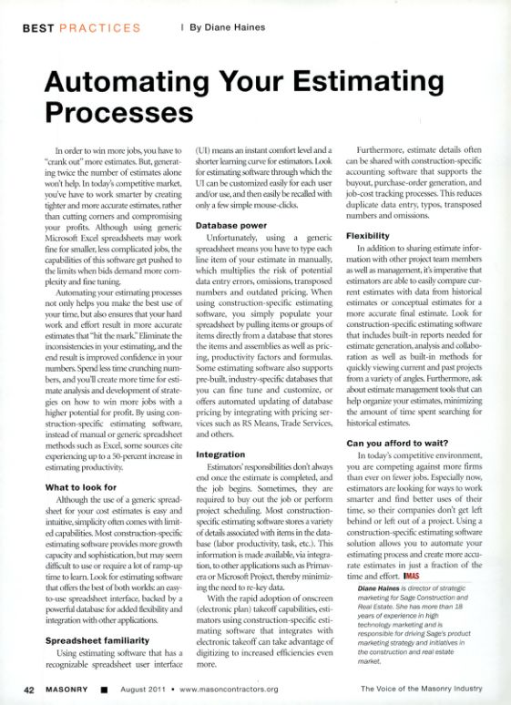 Automating your estimating processes not only helps you make the best use of your time, but also ensures that your hard work and effort result in more accurate estimates that "hit the mark." Eliminate the inconsistencies in your estimating, and the end result is improved confidence in your numbers. Spend less time crunching numbers, and you'll create more time for estimate analysis and development of strategies on how to win more jobs with a higher potential for profit. By using construction-specific estimating software, instead of manual or generic spreadsheet methods such as Excel, some sources cite experiencing up to a 50-percent increase in estimating productivity.