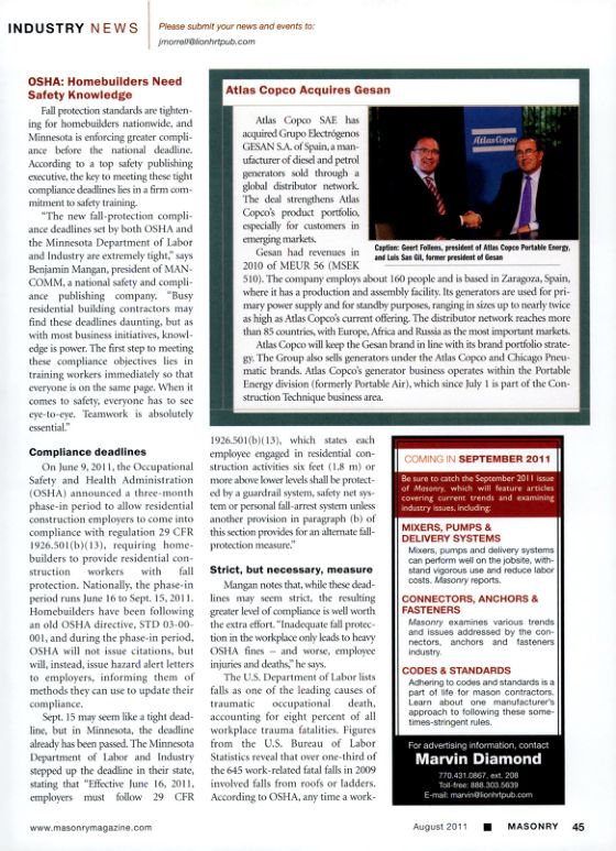 "The new fall-protection compliance deadlines set by both OSHA and the Minnesota Department of Labor and Industry are extremely tight," says Benjamin Mangan, president of MAN-COMM, a national safety and compliance publishing company. "Busy residential building contractors may find these deadlines daunting, but as with most business initiatives, knowledge is power. The first step to meeting these compliance objectives lies in training workers immediately so that everyone is on the same page. When it comes to safety, everyone has to see eye-to-eye. Teamwork is absolutely essential."
