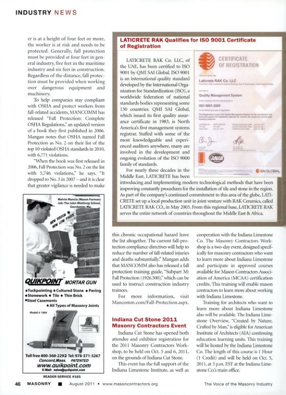 LATICRETE RAK Qualifies for ISO 9001 Certificate of Registration