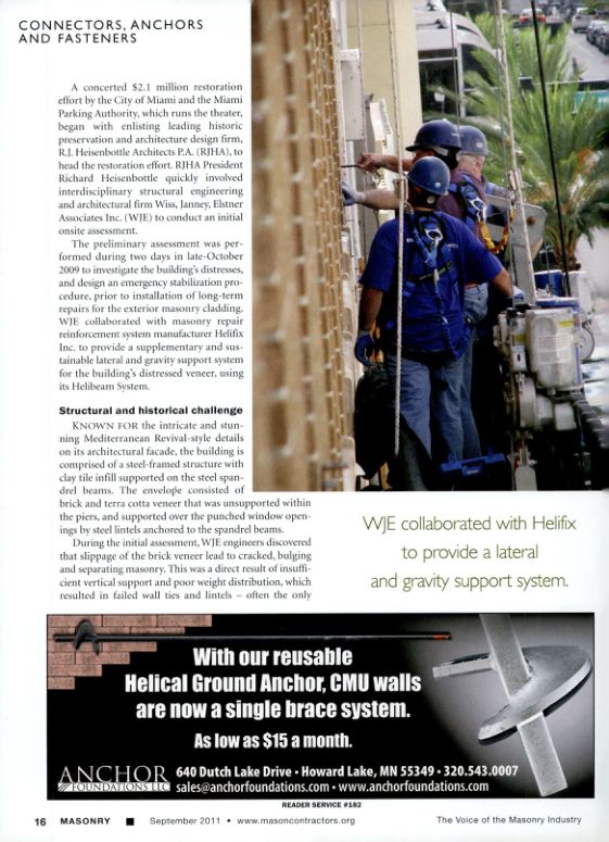 A concerted $2.1 million restoration effort by the City of Miami and the Miami Parking Authority, which runs the theater, began with enlisting leading historic preservation and architecture design firm, R.J. Heisenbottle Architects P.A. (RJHA), to head the restoration effort. RJHA President Richard Heisenbottle quickly involved interdisciplinary structural engineering and architectural firm Wiss, Janney, Elstner Associates Inc. (WJE) to conduct an initial onsite assessment.