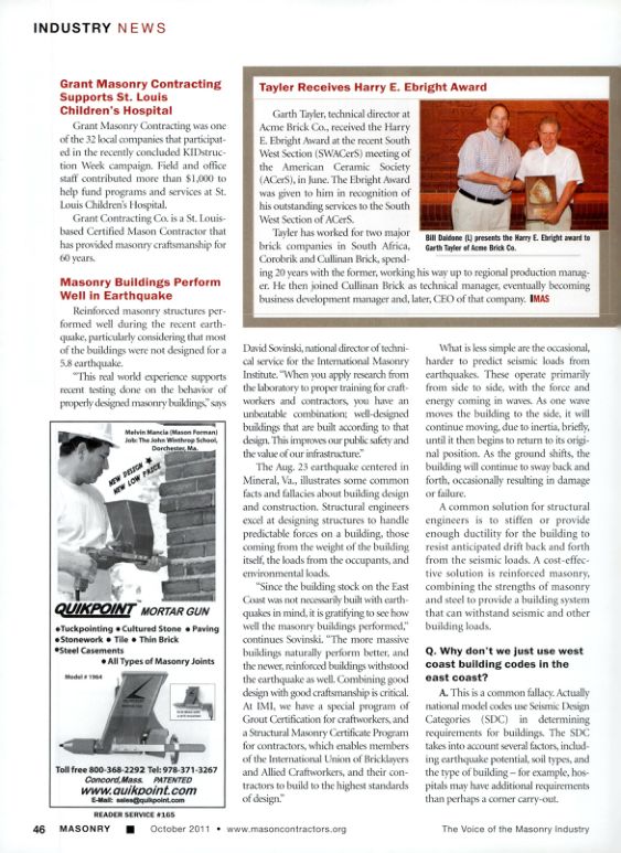 "Since the building stock on the East Coast was not necessarily built with earthquakes in mind, it is gratifying to see how well the masonry buildings performed," continues Sovinski. "The more massive buildings naturally perform better, and the newer, reinforced buildings withstood the earthquake as well. Combining good design with good craftsmanship is critical. At IMI, we have a special program of Grout Certification for craftworkers, and a Structural Masonry Certificate Program for contractors, which enables members of the International Union of Bricklayers and Allied Craftworkers, and their contractors to build to the highest standards of design."