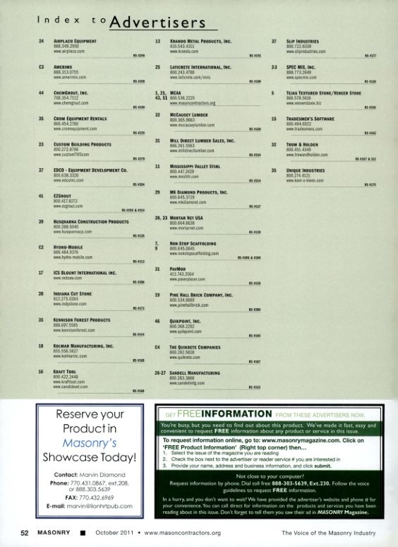 Get free information from these advertisers now. You're busy, but you need to find out about this product. We've made it fast, easy and convenient to request free information about any product or service in this issue. To request information online, go to: www.masonrymagazine.com. Click on 'FREE Product Information' (Right top corner) then.... 1. Select the issue of the magazine you are reading 2. Check the box next to the advertiser or reader service you are interested in 3. Provide your name, address and business information, and click submit.