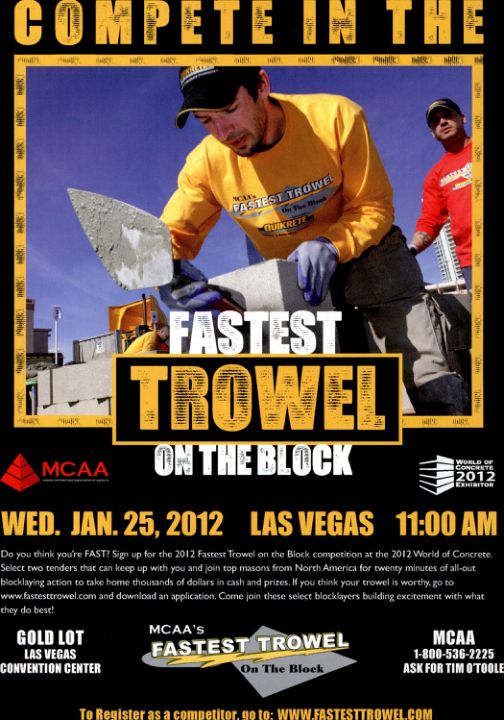 Do you think you're FAST? Sign up for the 2012 Fastest Trowel on the Block competition at the 2012 World of Concrete. Select two tenders that can keep up with you and join top masons from North America for twenty minutes of all-out blocklaying action to take home thousands of dollars in cash and prizes. If you think your trowel is worthy, go to www.fastesttrowel.com and download an application. Come join these select blocklayers building excitement with what they do best!