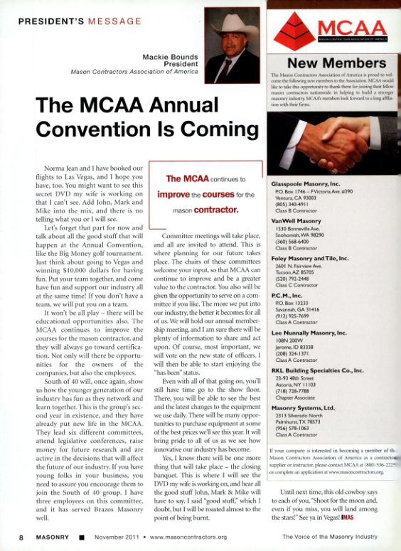 South of 40 will, once again, show us how the younger generation of our industry has fun as they network and learn together. This is the group's second year in existence, and they have already put new life in the MCAA. They lead six different committees, attend legislative conferences, raise money for future research and are active in the decisions that will affect the future of our industry. If you have young folks in your business, you need to assure you encourage them to join the South of 40 group. I have three employees on this committee, and it has served Brazos Masonry well.