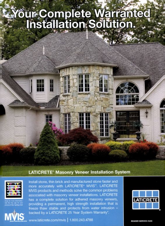 Install stone, thin brick and manufactured stone faster and more accurately with LATICRETE MVIS". LATICRETE MVIS products and methods solve the common problems associated with masonry veneer installations. LATICRETE has a complete solution for adhered masonry veneers, providing a permanent, high strength installation that is freeze thaw stable and protects from water intrusion backed by a LATICRETE 25 Year System Warranty". www.laticrete.com/mvis | 1.800.243.4788