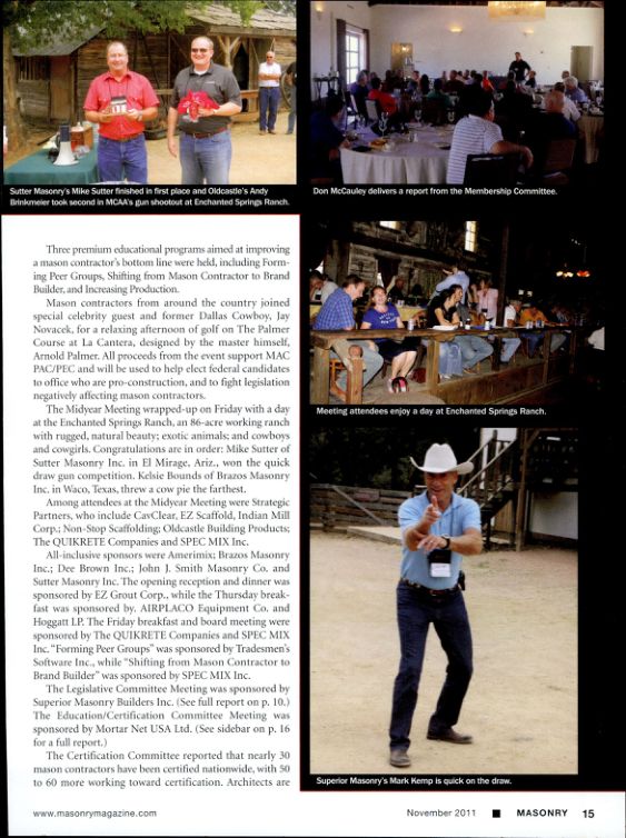 The Midyear Meeting wrapped-up on Friday with a day at the Enchanted Springs Ranch, an 86-acre working ranch with rugged, natural beauty; exotic animals, and cowboys and cowgirls. Congratulations are in order: Mike Sutter of Sutter Masonry Inc. in El Mirage, Ariz., won the quick draw gun competition. Kelsie Bounds of Brazos Masonry Inc. in Waco, Texas, threw a cow pie the farthest.
