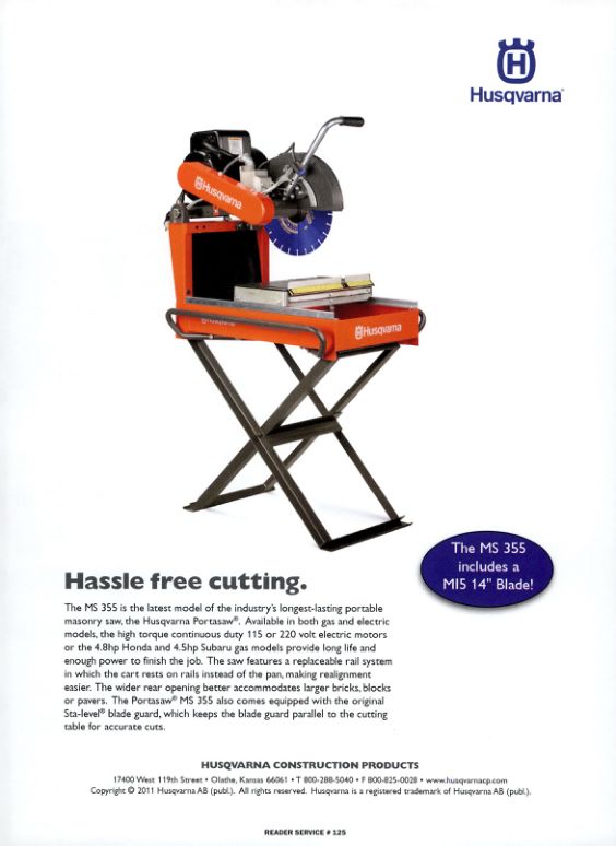 The MS 355 is the latest model of the industry's longest-lasting portable masonry saw, the Husqvarna Portasaw. Available in both gas and electric models, the high torque continuous duty 115 or 220 volt electric motors or the 4.8hp Honda and 4.5hp Subaru gas models provide long life and enough power to finish the job. The saw features a replaceable rail system in which the cart rests on rails instead of the pan, making realignment easier. The wider rear opening better accommodates larger bricks, blocks or pavers. The Portasaw MS 355 also comes equipped with the original Sta-level blade guard, which keeps the blade guard parallel to the cutting table for accurate cuts.