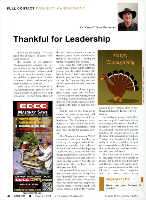 This month, as we celebrate Thanksgiving, it is especially true - for our country, for her people, and for her laws, morals and traditions. And, it is as true today for mason contractors and their employees and families, as it was to those patriots and pioneers hundreds of years ago.