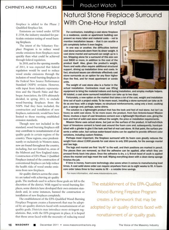 Fortunately, a new option on the market that takes a lot of the cost, weight and installation time out of such a project exists. To be more exact, installing a stone surround can take as little as one hour, with a single helper, no structural reinforcements, using only a level, caulking gun, a sponge and, perhaps, some shims.