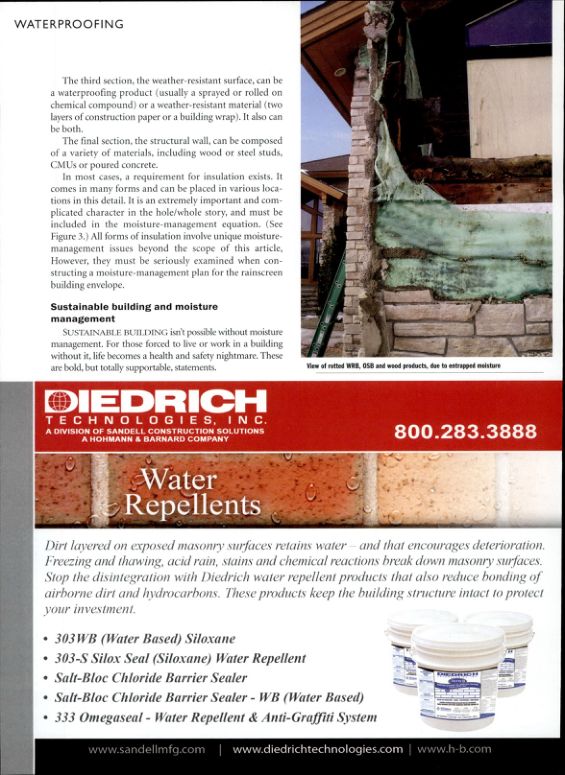 Dirt layered on exposed masonry surfaces retains water and that encourages deterioration. Freezing and thawing, acid rain, stains and chemical reactions break down masonry surfaces. Stop the disintegration with Diedrich water repellent products that also reduce bonding of airborne dirt and hydrocarbons. These products keep the building structure intact to protect your investment.