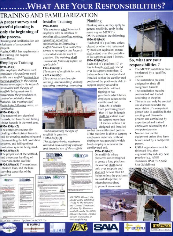 * OSHA regulations must be followed first, then augmented by industry best practice (e.g. ANSI standards, IPAF/SIA Safe Use Guidelines)
