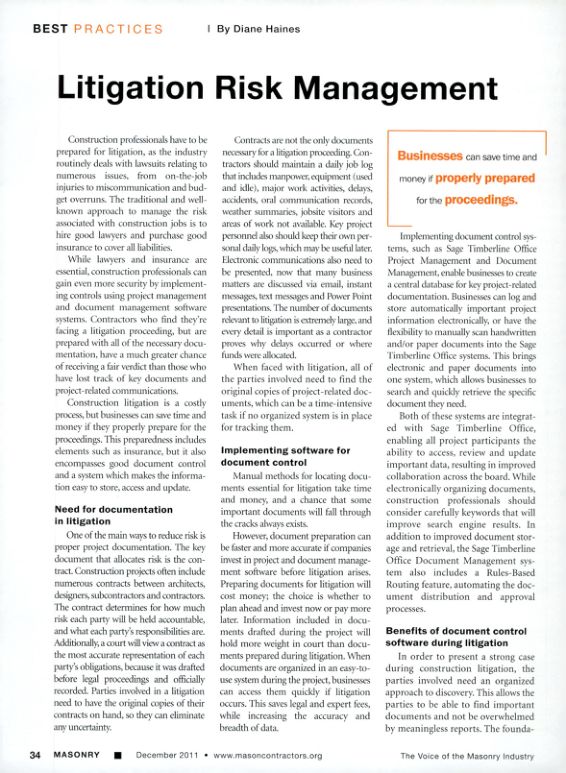 Construction litigation is a costly process, but businesses can save time and money if they properly prepare for the proceedings. This preparedness includes elements such as insurance, but it also encompasses good document control and a system which makes the information easy to store, access and update.