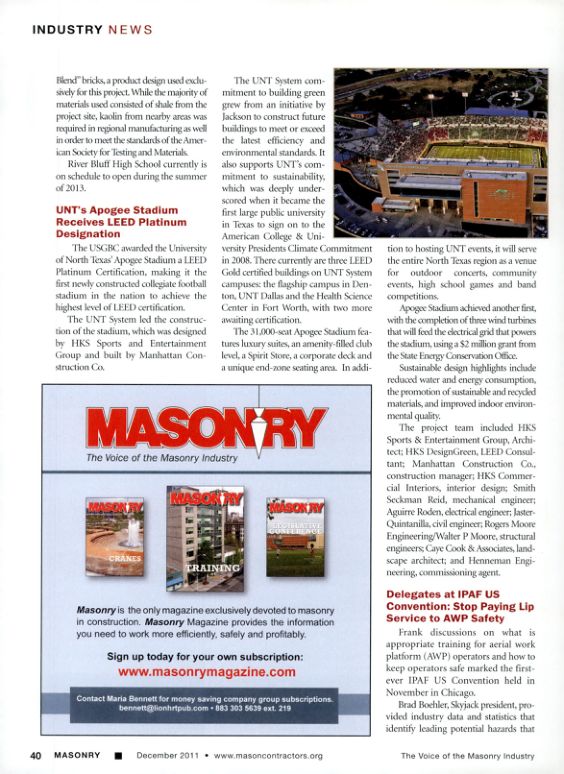 The USGBC awarded the University of North Texas Apogee Stadium a LEED Platinum Certification, making it the first newly constructed collegiate football stadium in the nation to achieve the highest level of LEED certification.