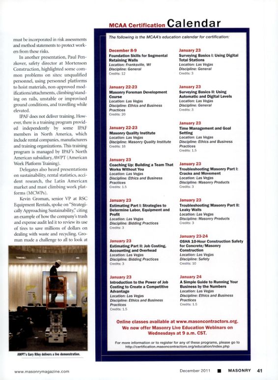 Online classes available at www.masoncontractors.org. We now offer Masonry Live Education Webinars on Wednesdays at 9 a.m. CST.