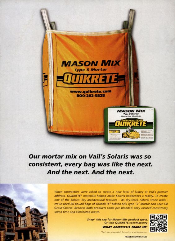 When contractors were asked to create a new level of luxury at Vail's premier address, QUIKRETE materials helped make Solaris Residences a reality. To create one of the Solaris' key architectural features its dry-stack natural stone walls crews used 80 pound bags of QUIKRETE Mason Mix Type "S" Mortar and Core-Fill Grout-Coarse. Because both products come pre-blended, they assured consistency, saved time and eliminated waste.