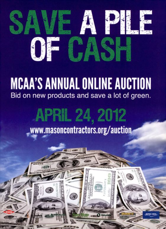 Masonry Magazine March 2012 Page. 53 Masonry Magazine March 2012 Page. 53 SAVE A PILE OF CASHMCAA'S ANNUAL ONLINE AUCTIONBid on new products and save a lot of green.APRIL 24, 2012www.masoncontractors.org/auction