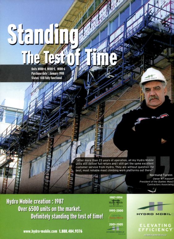 "After more than 23 years of operation, all my Hydro Mobile units still deliver full return and I still get the same excellent customer service from Hydro. They are without question the best, most reliable mast climbing work platforms out there", Normand Turenn, Owner NT mason, President of the Quebec Masc Contractors Associatic.