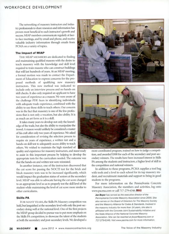 Jan Boyer has served as the executive director of the Pennsylvania Concrete Masonry Association since 2000. She also serves on the Board of Directors for The Masonry Society and the Masonry Alliance for Codes & Standards. Involved in the masonry industry for more than 14 years, she also is affiliated with the Concrete Joint Sustainability Initiative and the State Alliance of the National Concrete Masonry Association. She can be reached at jboyer@pacma.com or 717-279-6346. Visit www.pacma.com for more information.