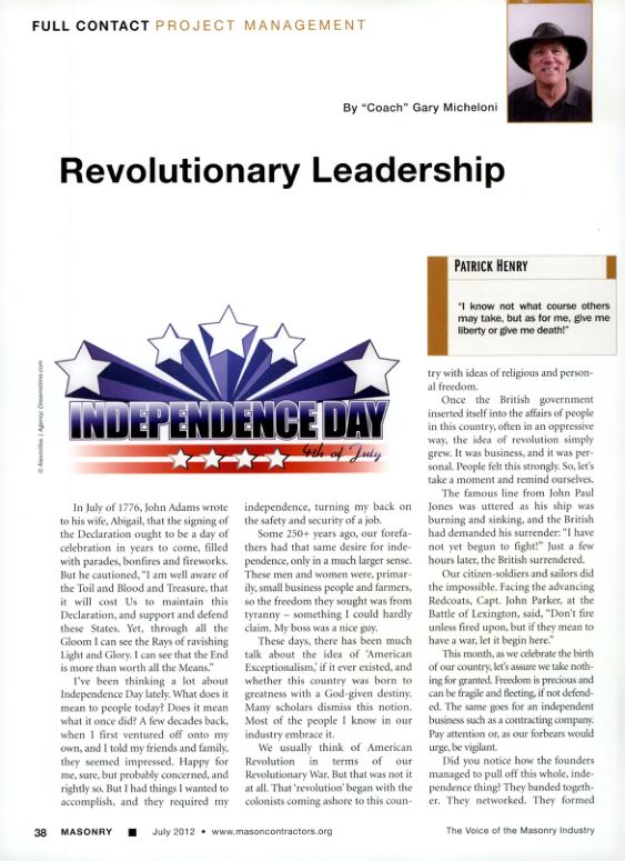This month, as we celebrate the birth of our country, let's assure we take nothing for granted. Freedom is precious and can be fragile and fleeting, if not defended. The same goes for an independent business such as a contracting company. Pay attention or, as our forbears would urge, be vigilant.