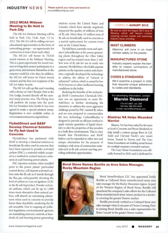 PAC injection systems, when installed prior to the power plants' particulate control device, will deposit activated carbon onto the fly ash as it travels through the flue gas, subsequently elevating the level of carbon or Loss on Ignition (LOI) in the fly ash byproduct. Powder activated carbons, which can be up to 1,000 times more absorptive than natural carbon, will absorb air entraining admixtures when used in concrete to provide freeze thaw durability, rendering the fly ash unusable. Due to ongoing air pollution legislation, environmental agencies are mandating mercury controls at hundreds of coal-burning power generating www.masonrymagazine.com stations across the United States and Canada, which have already negatively impacted the quality of millions of tons of fly ash. More than 10 million tons of fly ash are beneficially used in concrete as a partial replacement for cement every year in the United States.