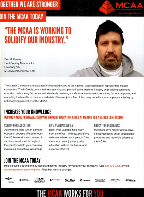 The Mason Contractors Association of America (MCAA) is the national trade association representing mason contractors. The MCAA is committed to preserving and promoting the masonry industry by providing continuing education, advocating fair codes and standards, fostering a safe work environment, recruiting future manpower, and marketing the benefits of masonry materials. Discover just a few of the many benefits your company is missing by not becoming a member of the MCAA.