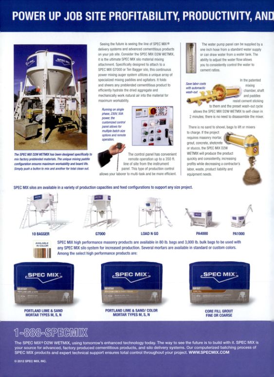 The SPEC MIX® D2W WETMIX, using tomorrow's enhanced technology today. The way to see the future is to build with it. SPEC MIX is your source for advanced, factory produced cementitious products, and silo delivery systems. Our computerized batching process of SPEC MIX products and expert technical support ensures total control throughout your project. WWW.SPECMIX.COM