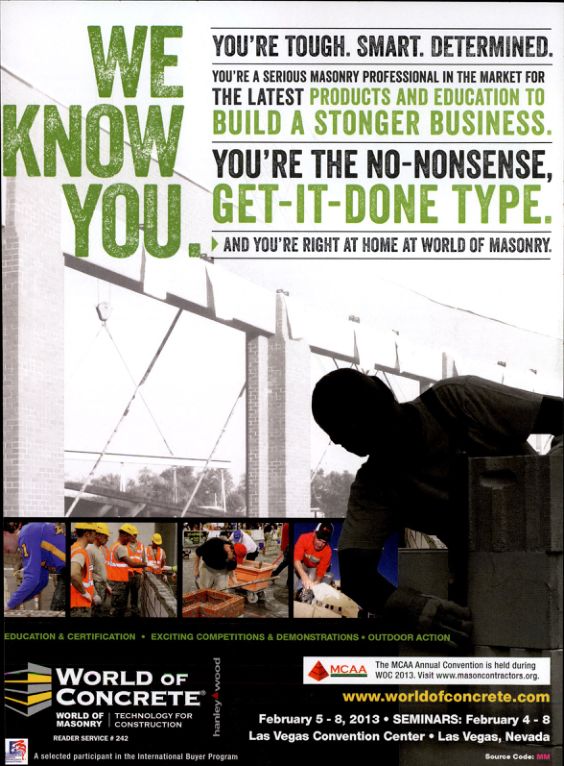 YOU'RE TOUGH. SMART. DETERMINED. YOU'RE A SERIOUS MASONRY PROFESSIONAL IN THE MARKET FOR THE LATEST PRODUCTS AND EDUCATION TO BUILD A STONGER BUSINESS. YOU'RE THE NO-NONSENSE, GET-IT-DONE TYPE. AND YOU'RE RIGHT AT HOME AT WORLD OF MASONRY.