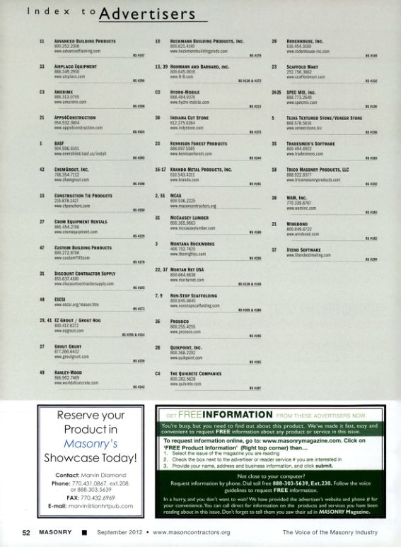 In a hurry, and you don't want to wait? We have provided the advertiser's website and phone ff for your convenience. You can call direct for information on the products and services you have been reading about in this issue. Don't forget to tell them you saw their ad in MASONRY Magazine.