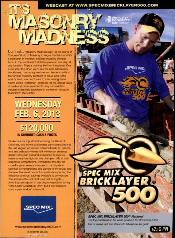 Don't miss "Masonry Madness Day" at the World of Concrete/World of Masonry in Vegas this February! It's a collection of the most exciting masonry competitions in the world and it all takes place on one day, at one location. There's nothing like it on the planet! One event after the other, you'll see the best bricklayers, blocklayers, mason apprentices and tenders battle in four unique masonry contests to prove who is the world's best. You don't want to miss seeing these highly skilled craftsman compete for the largest value of cash and prizes awarded for any construction industry event held anywhere in the world-It's pure MASONRY MADNESS!