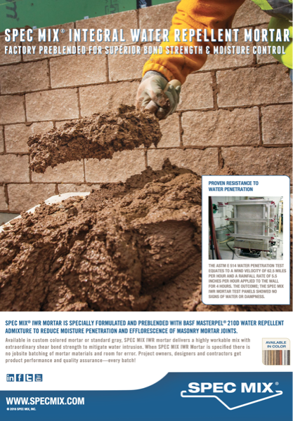 SPEC MIX�IWR MORTAR IS SPECIALLY FORMULATED AND PREBLENDED WITH BASF MASTERPEL�210D WATER REPELLENT ADMIXTURE TO REDUCE MOISTURE PENETRATION AND EFFLORESCENCE OF MASONRY MORTAR JOINTS.