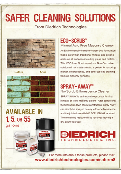 No-Scrub Efflorescence Cleaner SPRAY-AWAY is an innovative product for final removal of "New Masonry Bloom". After completing the final wash-down of new construction, Spray-Away can simply be sprayed on any leftover efflorescence