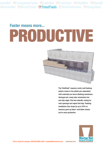The TotalFlash� masonry cavity wall flashing system comes to the jobsite pre-assembled with materials you lmow (flashing membrane, drainage mat weep tabs, termination bar and drip edge). Plus free takeoffs, cutting for wall openings and expert bid help. Flashing installation time drops by up to 500/o so masonry goes up faster-and faster means you're more productive.