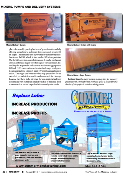 place ofmanually pouring buckets ofgrout into the walls by offering a machine to automate the pouring of grout with an auger. The standard unit is powered by auxiliary hydrau�lics from a forklift, which is also used to lift it into position. The forklift operator controls the auger. It can be configured into an extended auger tube for higher vertical reach. Ex�tending the auger tube reduces the maximum aggregate to 1/2 inch (12.5 mm), whereas the standard auger configura�tion is compatible with 3/4-inch (19-mm) aggregate grout mixes. The auger can be reversed to stop grout flow for an extended period of time and is easily removed for cleanup. Because they have to be elevated for use, material delivery systems are best suited for smaller batches of material from a mortar mixer versus larger loads from ready-mix trucks.