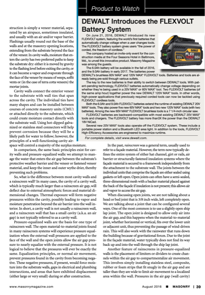 Md., to unveil this innovative product. Masonry Magazine the substrate dry: either it is moved by gravity was among the guests. to the flashing level before exiting the cavity, or The 6.0Ah battery will be available in the fall of 2016,