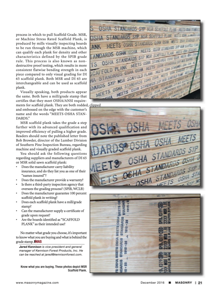 MSR scaffold plank takes the grade a step further with its advanced qualification and improved efficiency of pulling a higher grade. Readers should note the published letter from Bob Browder, director of the Lumber Division of Southern Pine Inspection Bureau, regarding machine and visually graded scaffold plank.