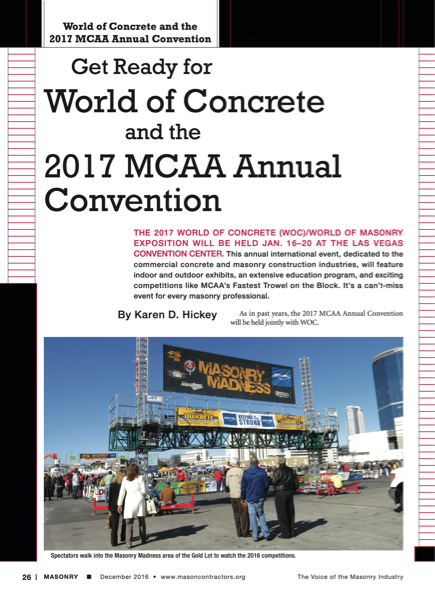 THE 2017 WORLD OF CONCRETE (WOC)/WORLD OF MASONRY EXPOSITION WILL BE HELD JAN. 16-20 AT THE LAS VEGAS CONVENTION CENTER. This annual international event, dedicated to the commercial concrete and masonry construction industries, will feature indoor and outdoor exhibits, an extensive education program, and exciting competitions like MCAA's Fastest Trowel on the Block. It's a can't-miss event for every masonry professional.